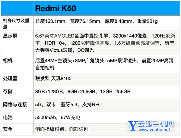 Redmi K50主要参数图: