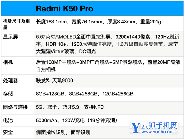 Redmi K50 Pro主要参数图: