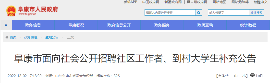 2022年新疆昌吉州阜康市面向社会招聘社区工作者、到村大学生补报名时间:12月3日-8日12-07