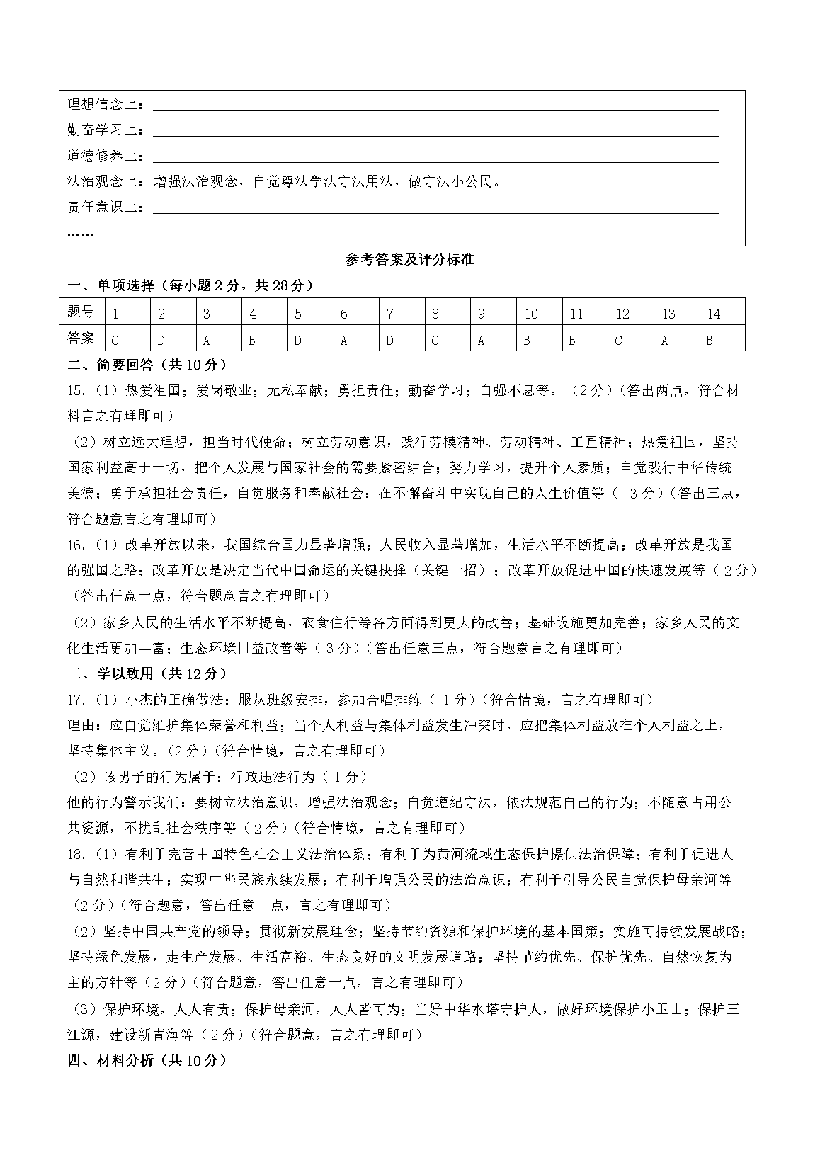 2023年青海海东中考道德与法治真题及答案(Word版)08-10