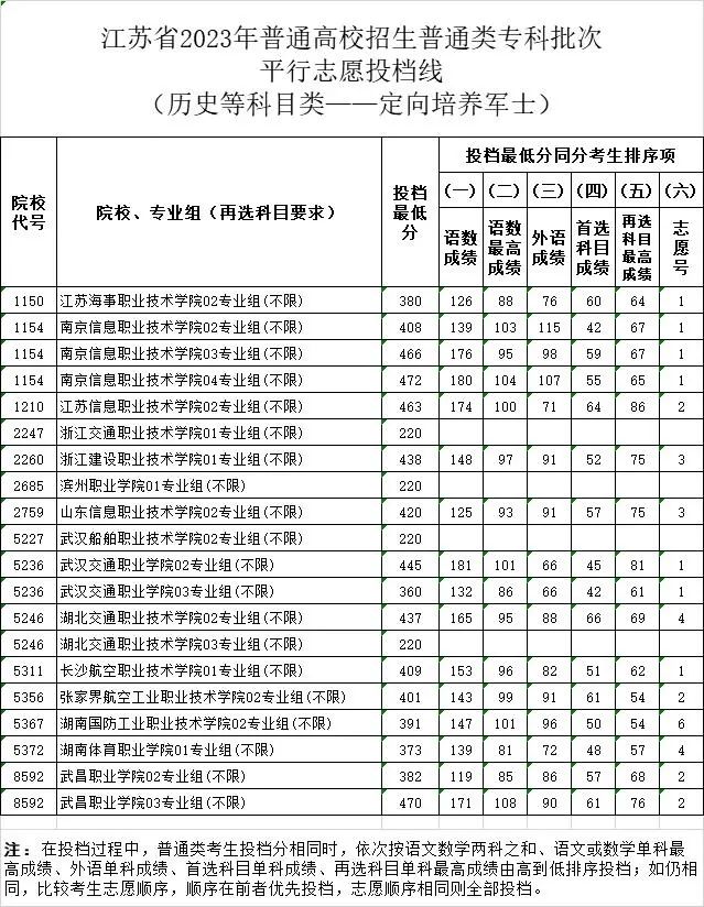 【#高考# 导语】®文档大全网高考频道从江苏省教育考试院了解到,2023年江苏高考招生普通类专科批次平行志愿投档线(定向培养军士)已公布,具体如下: