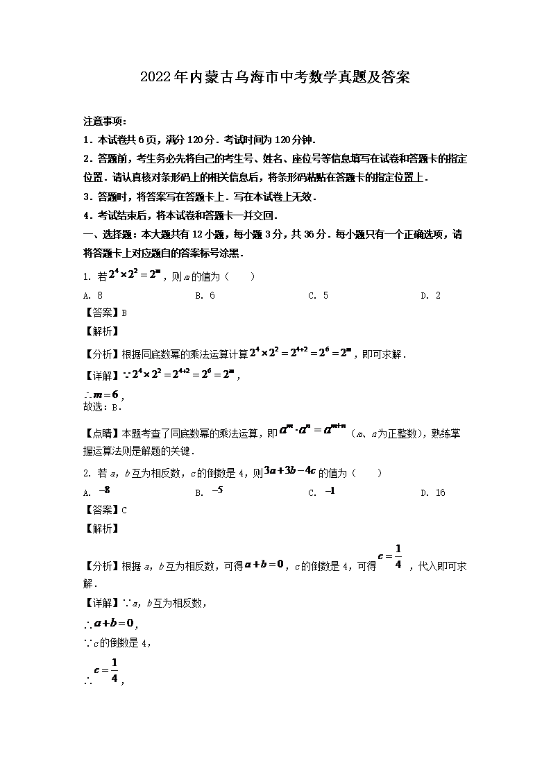 2022年内蒙古乌海市中考数学真题及答案(Word版)06-07