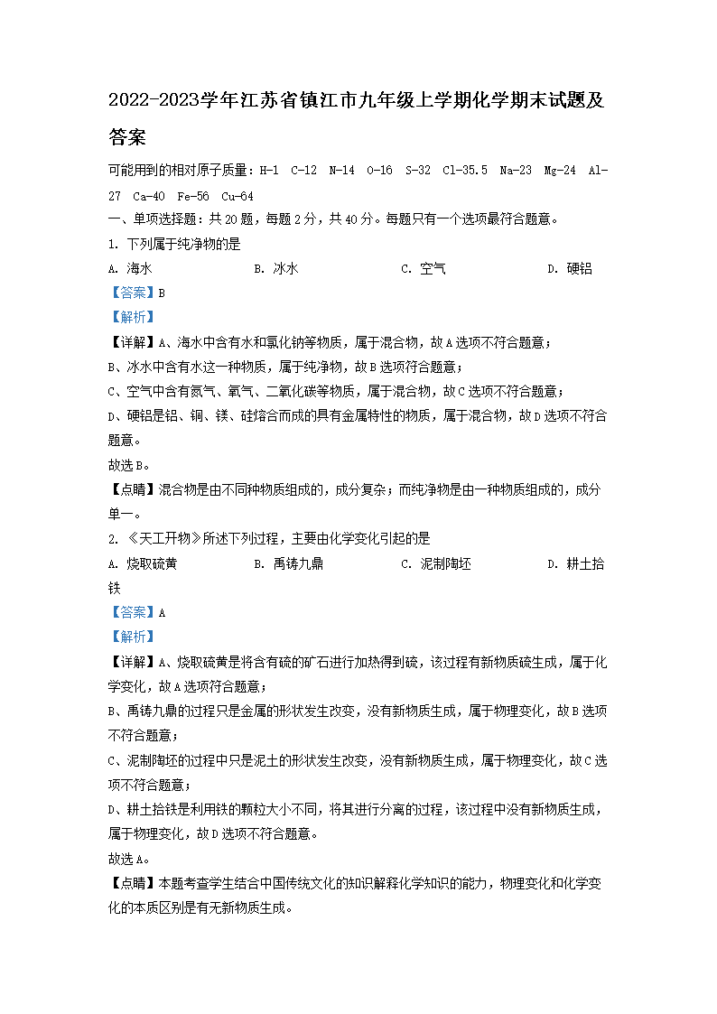 【文档预览】 文档大全网整理发布2022-2023学年江苏省镇江市九年级上学期化学期末试题及答案(Word版),前五页预览如下: