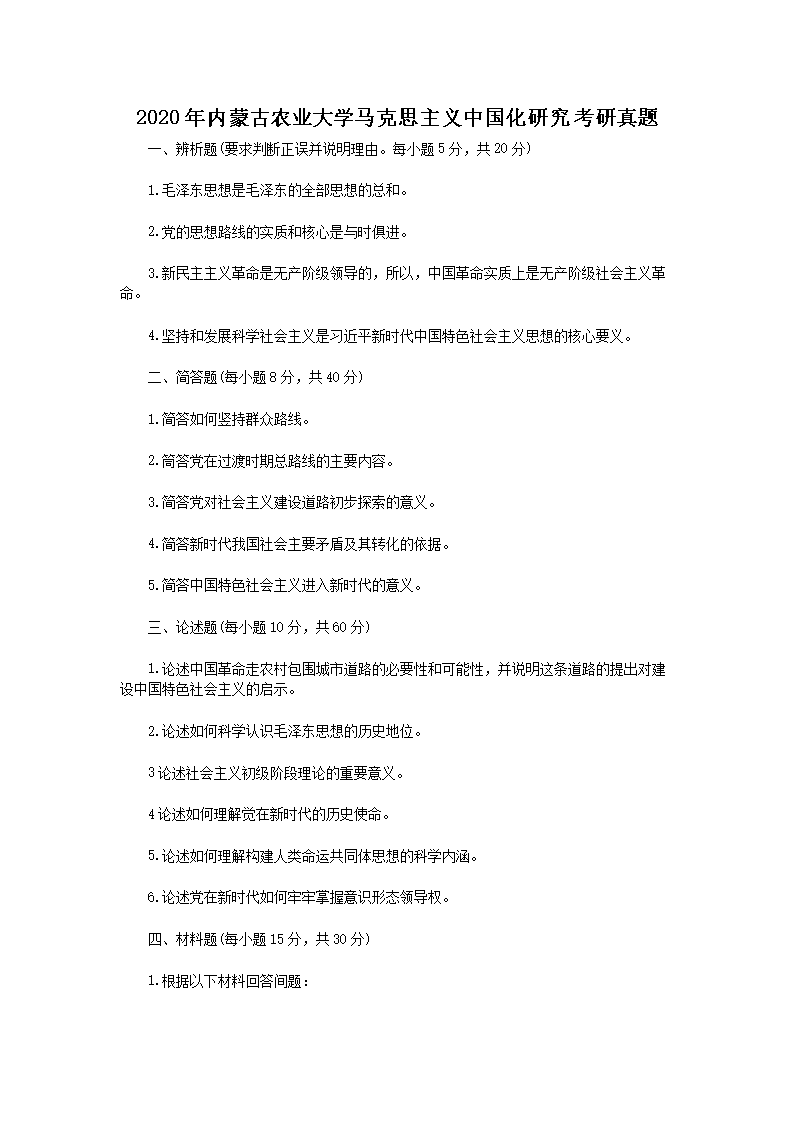 2020年内蒙古农业大学马克思主义中国化研究考研真题(Word版)07-25
