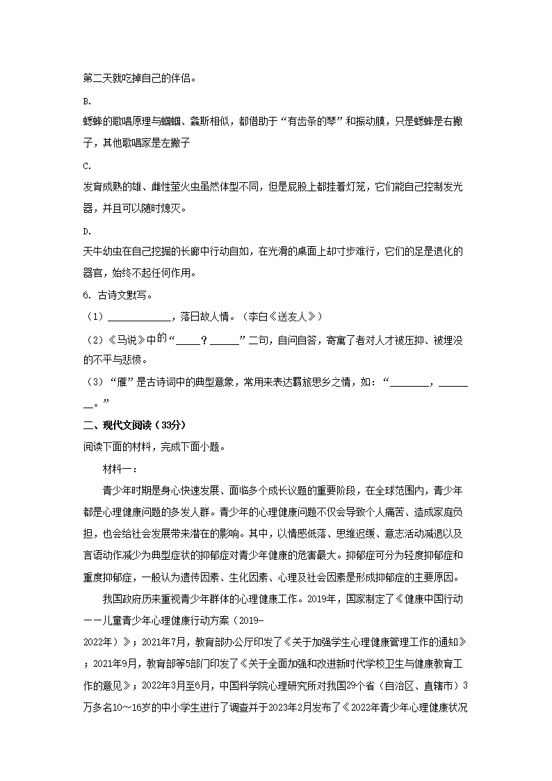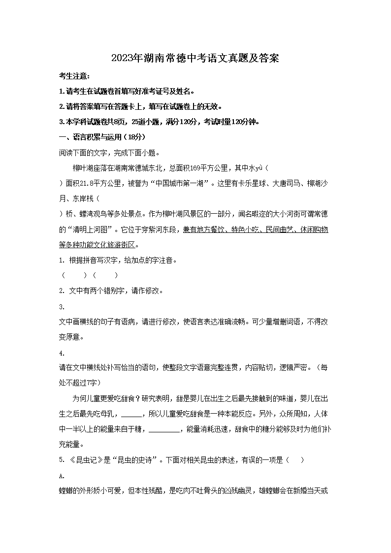 2023年湖南常德中考语文真题及答案(Word版)08-31