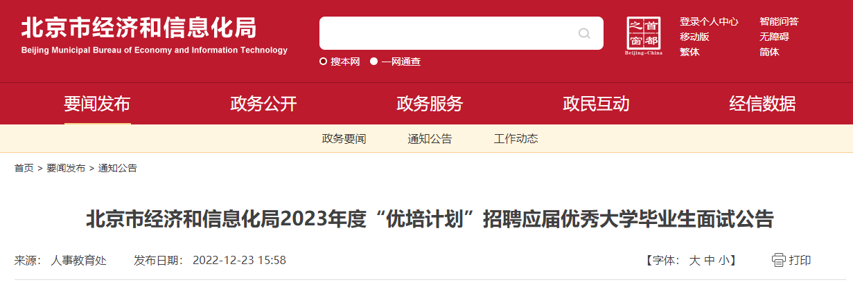 根据北京市2023年度“优培计划”招聘应届优秀大学毕业生工作安排,现将北京市经济和信息化局“优培计划”面试有关事项公告如下: