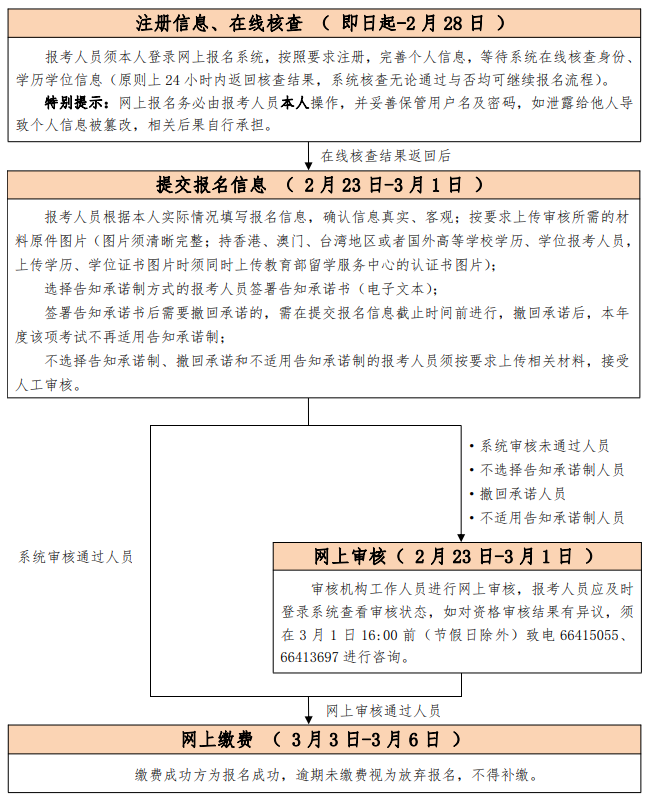 2.网上缴费时间为2023年3月3日至3月6日。完成报名提交并通过审核的人员可进行网上缴费,缴费成功方为报名成功。报考人员报名成功后,已缴费用不予退还。