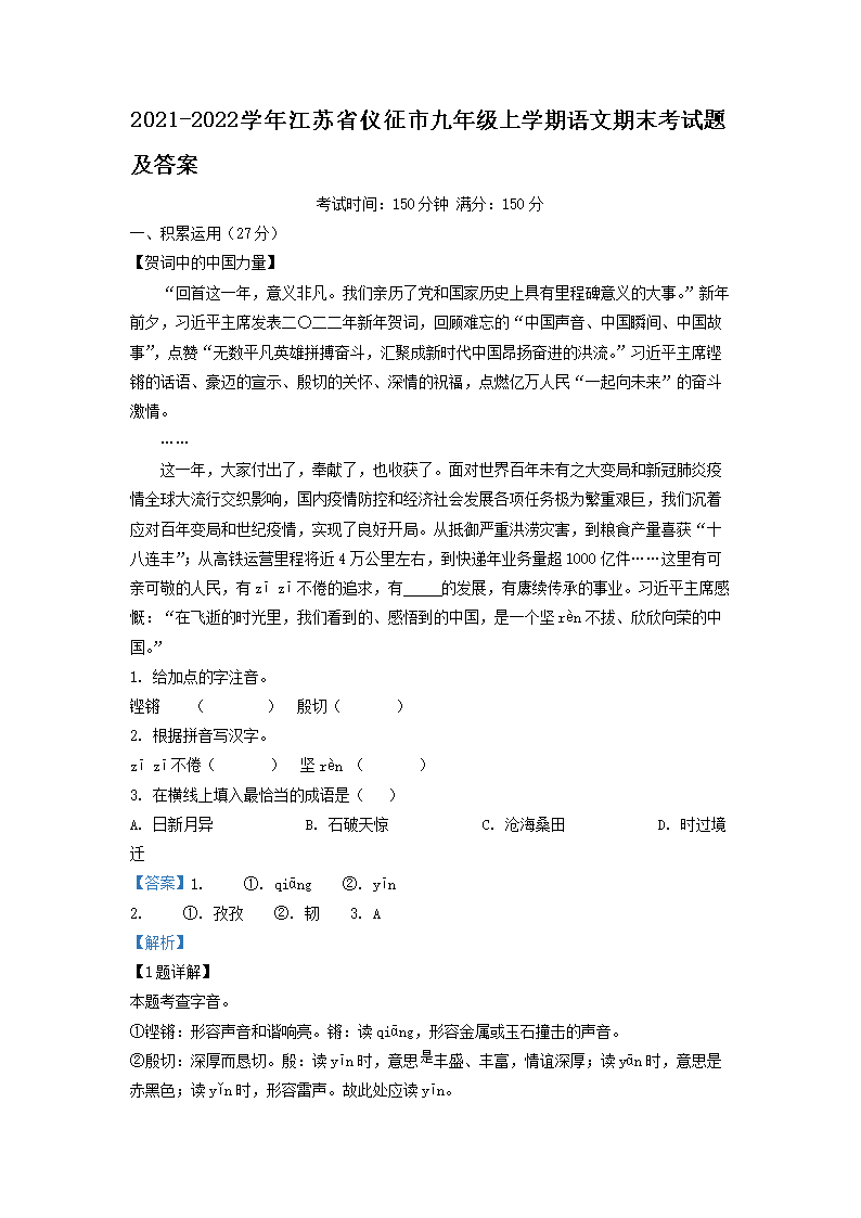 2021-2022学年江苏省仪征市九年级上学期语文期末考试题及答案(Word版)09-14