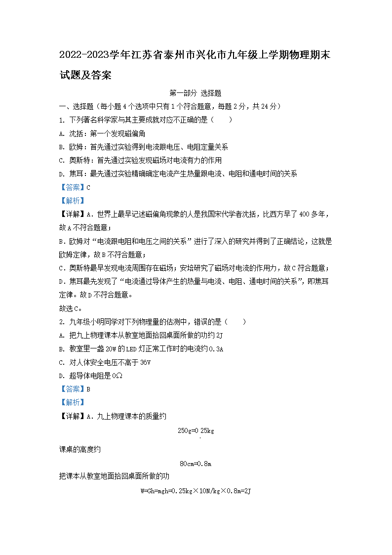 2022-2023学年江苏省泰州市兴化市九年级上学期物理期末试题及答案(Word版)10-14