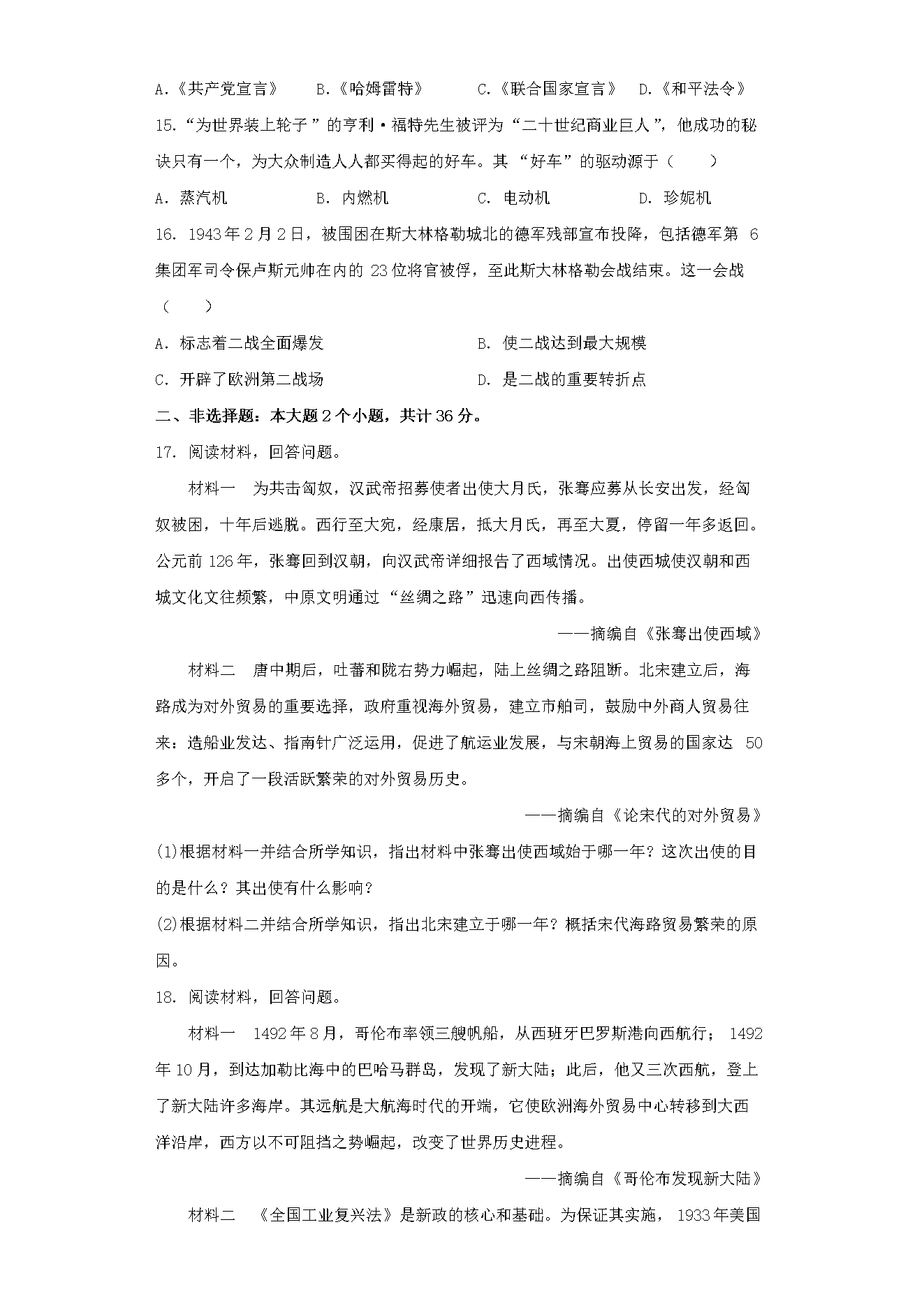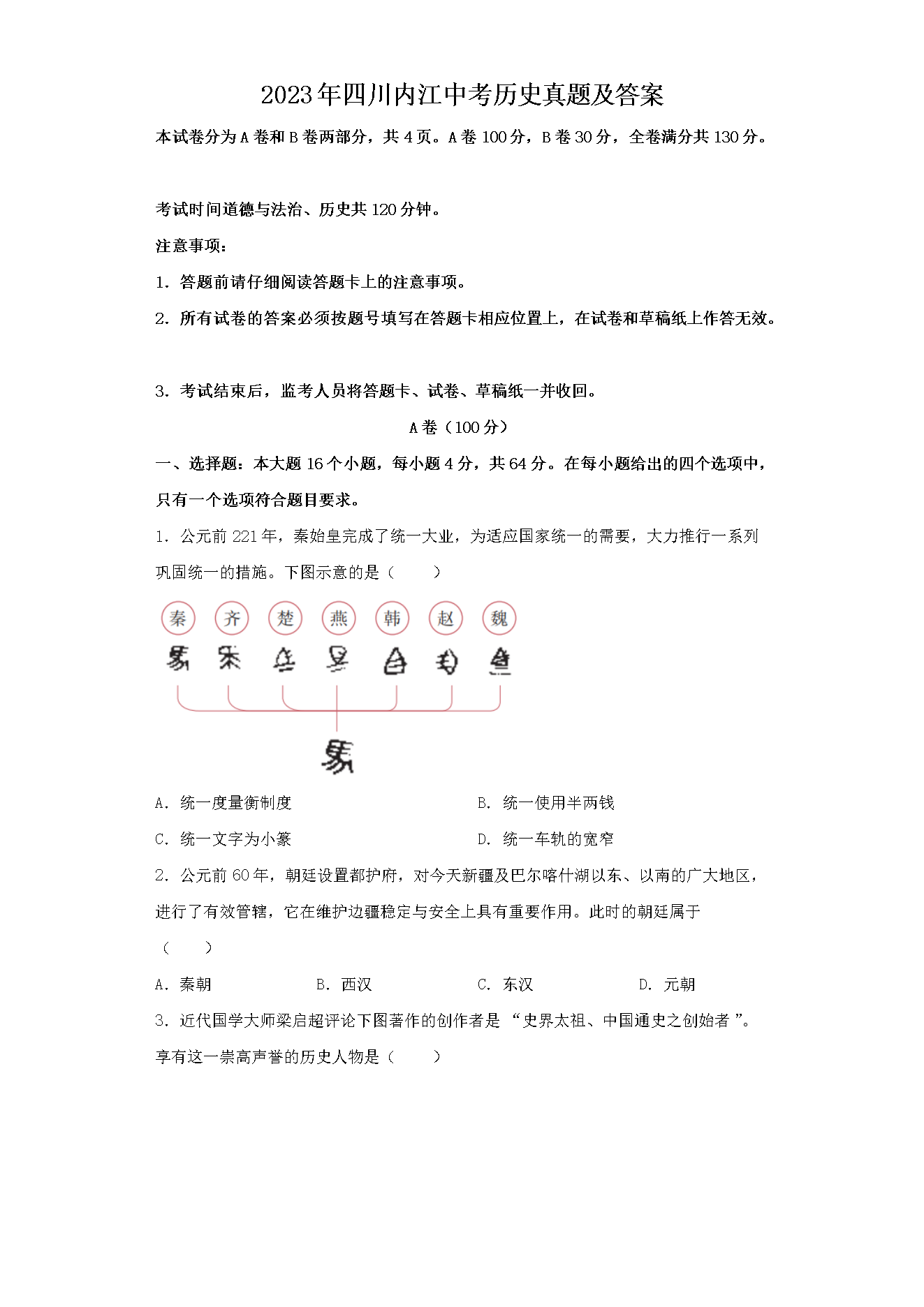 2023年四川内江中考历史真题及答案(Word版)07-17
