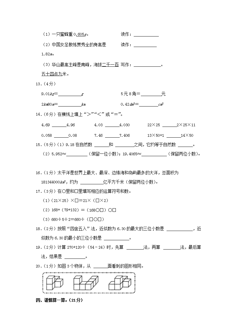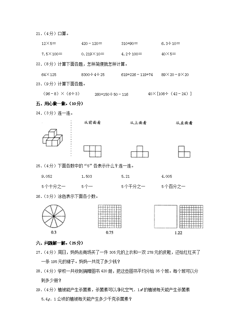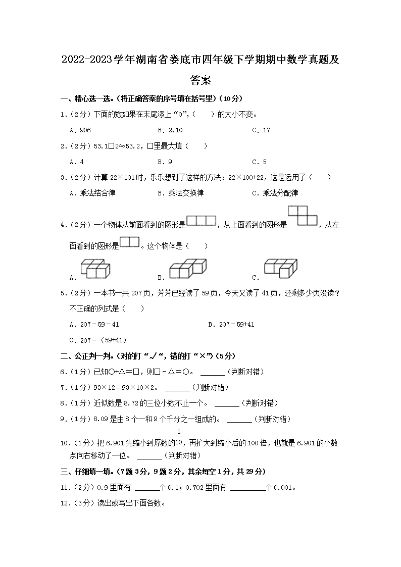 2022-2023学年湖南省娄底市四年级下学期期中数学真题及答案(Word版)10-12