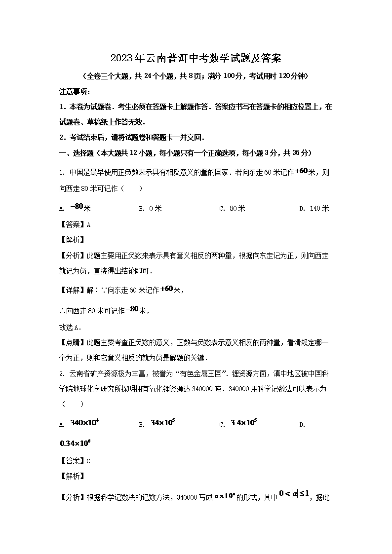 2023年云南普洱中考数学试题及答案(Word版)06-20