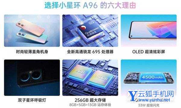 比较独特是主打双子星环呼吸灯设计,具体后置双摄 4800 万像素主摄 +200 万像素人像镜头,前置 1600 万像素,核心配置上 OPPO A96 搭载的是高通骁龙 695 处理器,支持双模 5G,4500mAh 电池 +33W 充电,运行 ColorOS 12 等。
