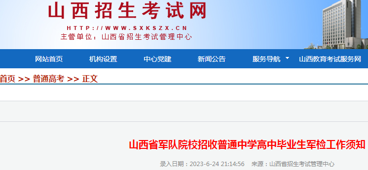 有意向报考军队院校的考生可登陆“山西招生考试网”,仔细阅读《军检工作须知》及其他军队院校招生相关通知。接到省招生考试管理中心参加军检的短信通知后,请按照规定时间参加。