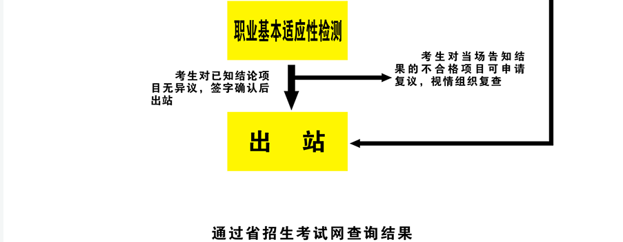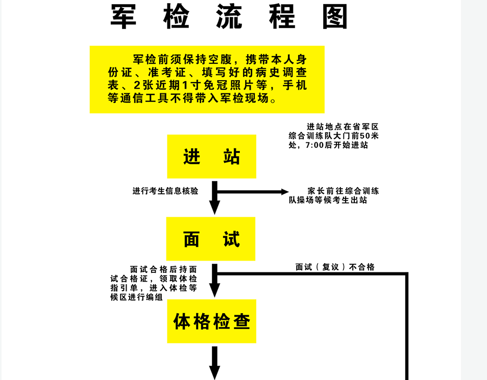 考生进入面试区后,首先查阅军检流程图和面试分组单,然后到面试待试区对应小组就座,填写考生信息,依次参加面试。面试合格者,考核组当场发给《面试合格证》,考生凭《面试合格证》进行体检登记,并领取体检指引单。对面试不合格的考生,面试考官现场向考生说明不合格原因。考生若对面试结果有异议,可向监督复议组申请复议,由监督复议组作出最终结论。面试表格中,需考生填写高中阶段体质测试综合评定成绩,请考生提前与就读学校确认个人体质测试结果,并对填写相关信息的准确性和真实性负责。