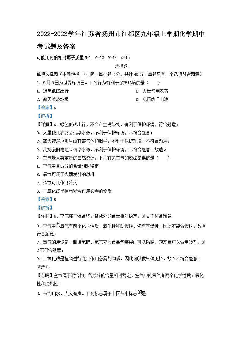 2022-2023学年江苏省扬州市江都区九年级上学期化学期中考试题及答案(Word版)09-22
