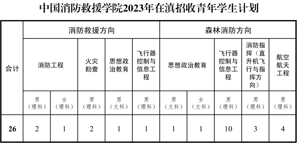 中国消防救援学院2023年在云南省招收26名青年学生(男生24名、女生2名),其中: