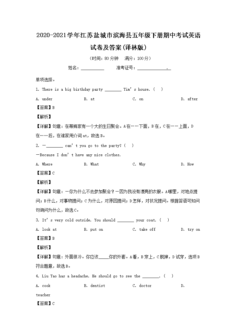 【文档预览】 文档大全网整理发布2020-2021学年江苏盐城市滨海县五年级下册期中考试英语试卷及答案(译林版)(Word版),前五页预览如下: