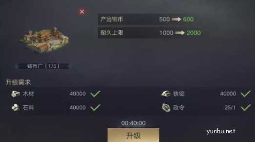 升级5个3级铸币厂则是需要40万石料,木材,铁锭,以及5个政令。时间又回到了1小时,看的出来后面的时间也是会陆续增加。