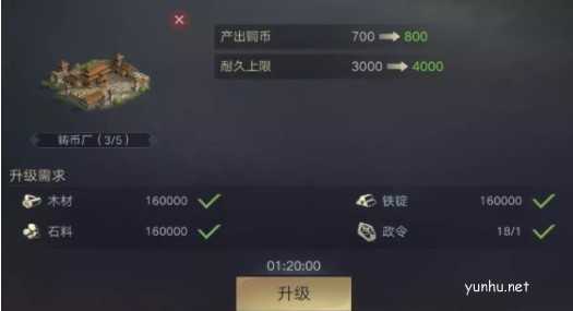 升级3级铸币厂,铜币产出变为700/每小时,耐久值变为3000。资源需求量与上一级相比,直接再次翻倍,就变成8万石料,木材,铁锭,以及一个政令。