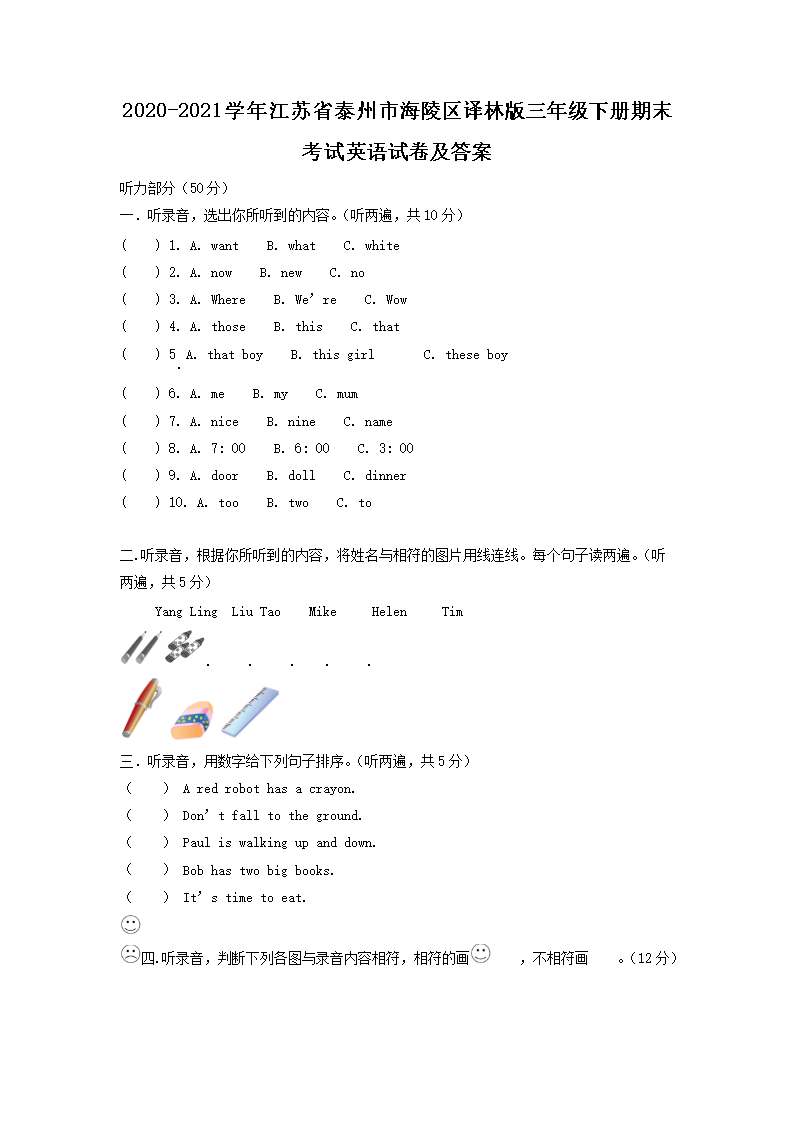 【文档预览】 文档大全网整理发布2020-2021学年江苏省泰州市海陵区译林版三年级下册期末考试英语试卷及答案(Word版),前五页预览如下: