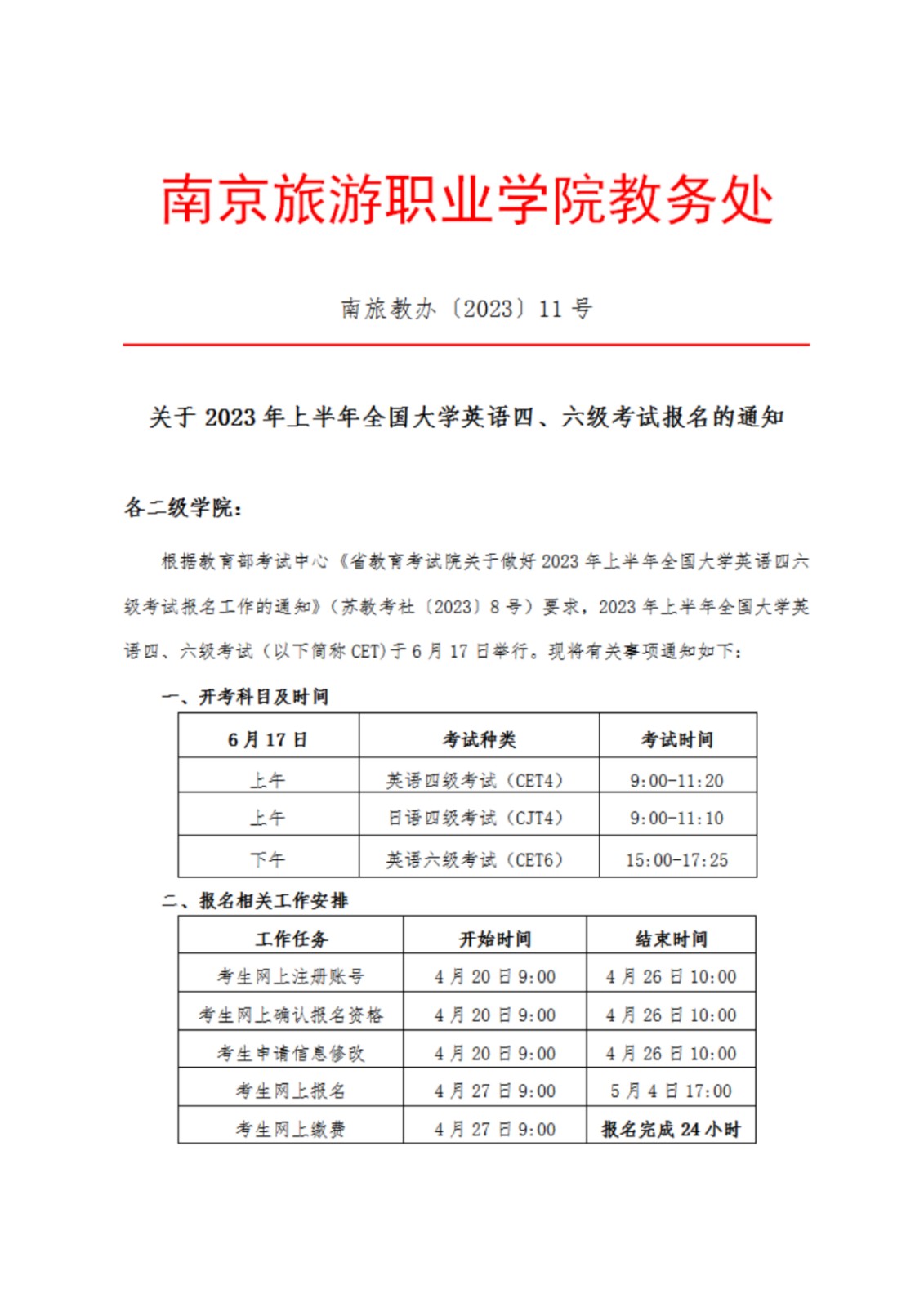 2023年上半年江苏南京旅游职业学院英语四、六级考试报名通知[报名时间4月27日起]04-24