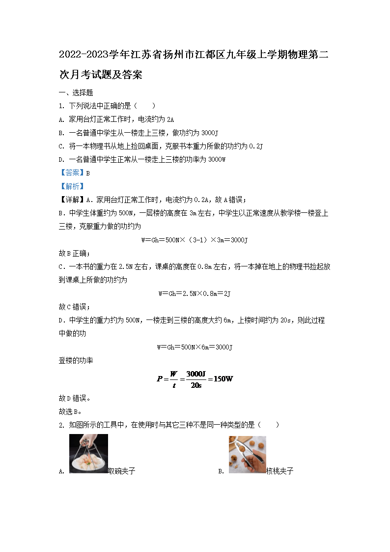 2022-2023学年江苏省扬州市江都区九年级上学期物理第二次月考试题及答案(Word版)10-17