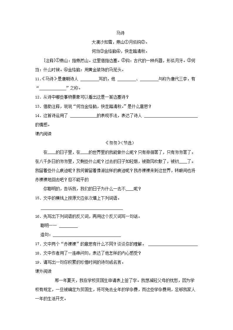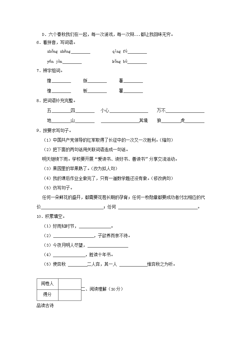 2023年四川巴中小升初语文真题及答案(Word版)09-27