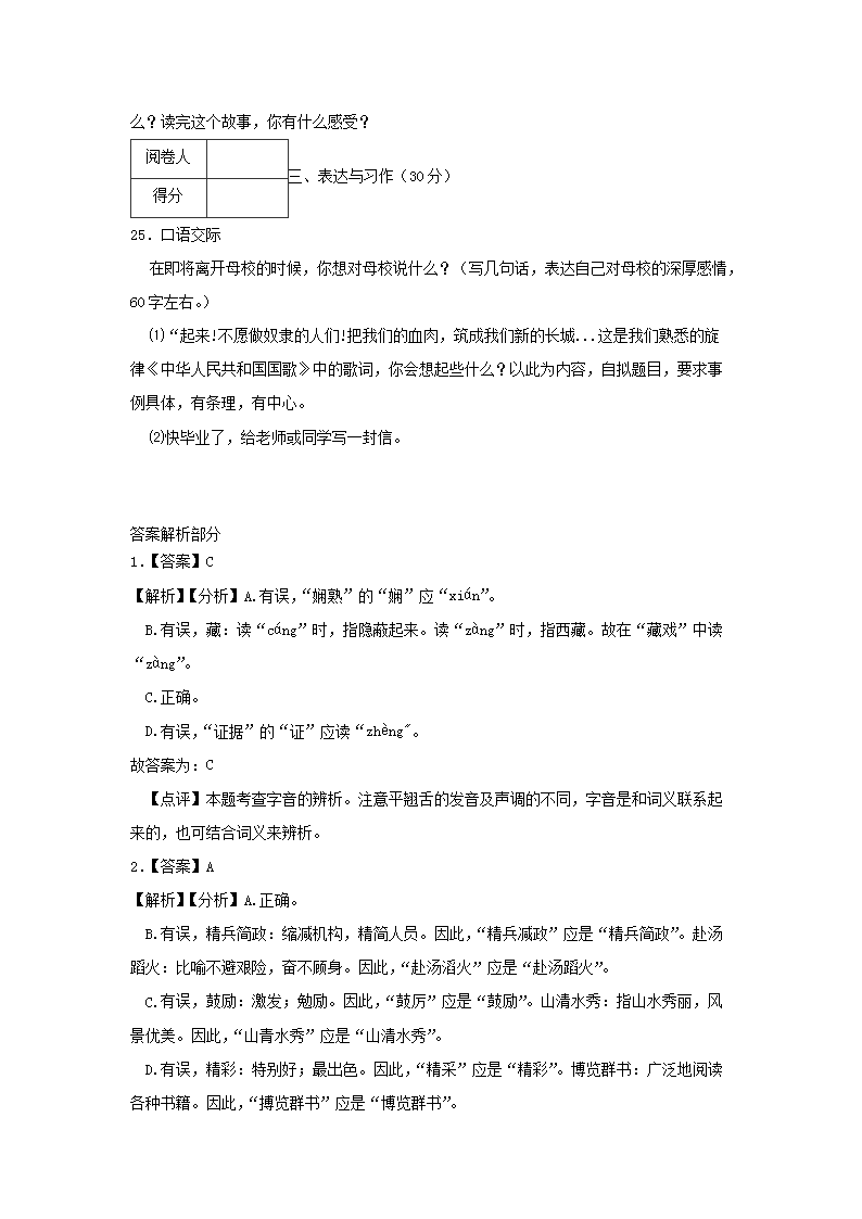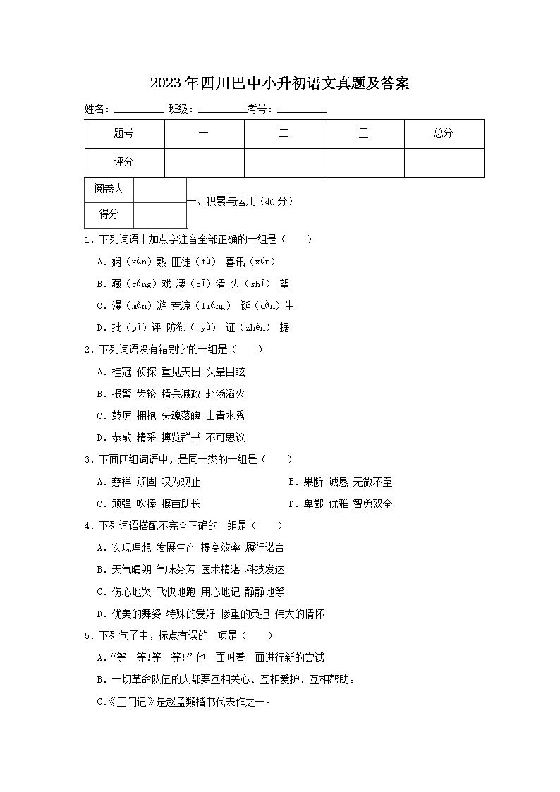 【文档预览】 文档大全网整理发布2023年四川巴中小升初语文真题及答案(Word版),前五页预览如下: