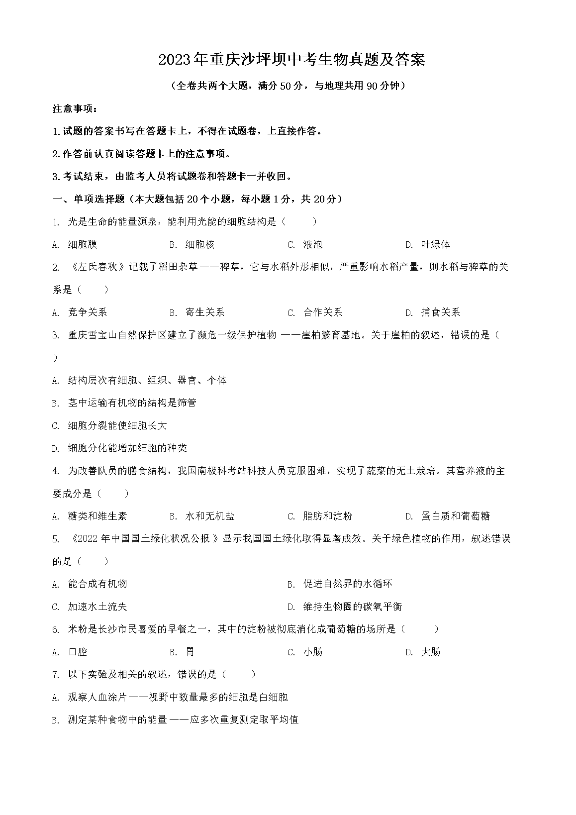 2023年重庆沙坪坝中考生物真题及答案(Word版)06-19