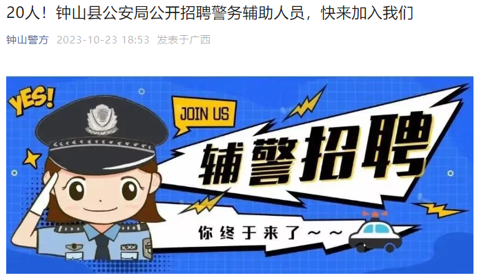 【#招警考试# #2023年广西贺州钟山县公安局招聘警务辅助人员公告(20人)#】®文档大全网从钟山警方了解到,2023年广西贺州钟山县公安局招聘警务辅助人员20人,相关事宜详情如下: