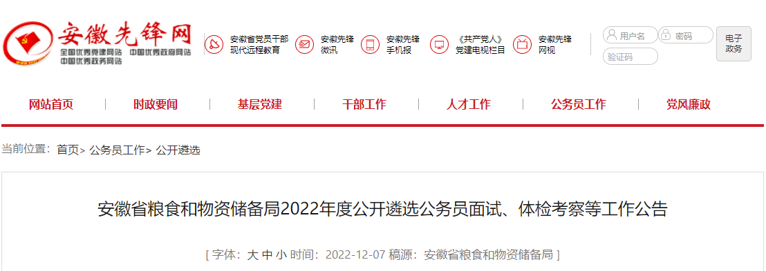 2022年安徽省粮食和物资储备局公开遴选公务员资格复审时间:12月13日-14日12-09