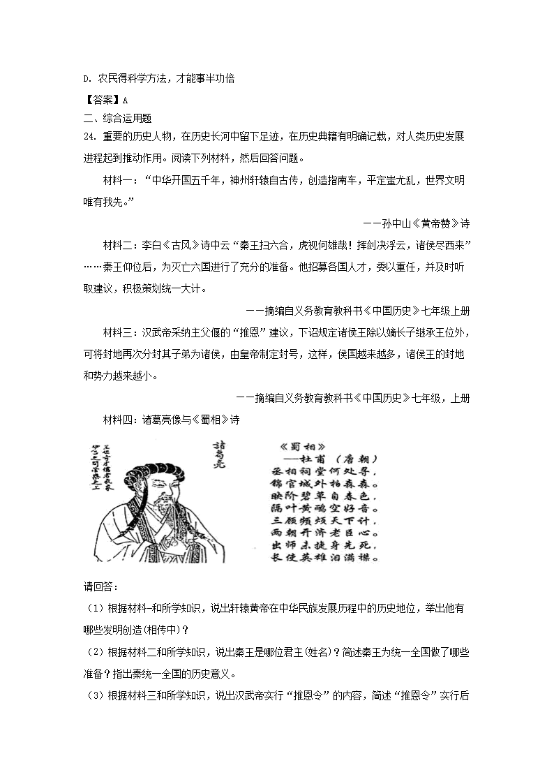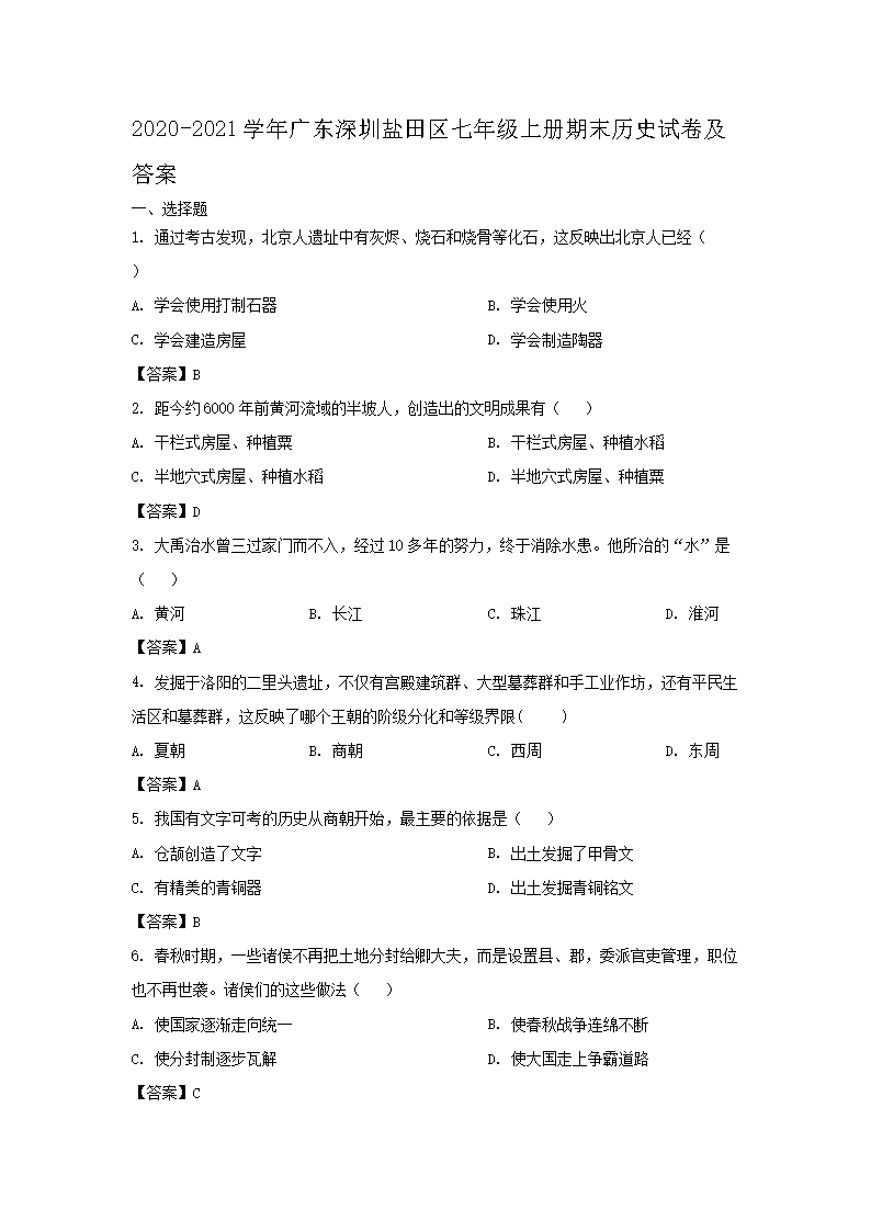 2020-2021学年广东深圳盐田区七年级上册期末历史试卷及答案(Word版)09-21
