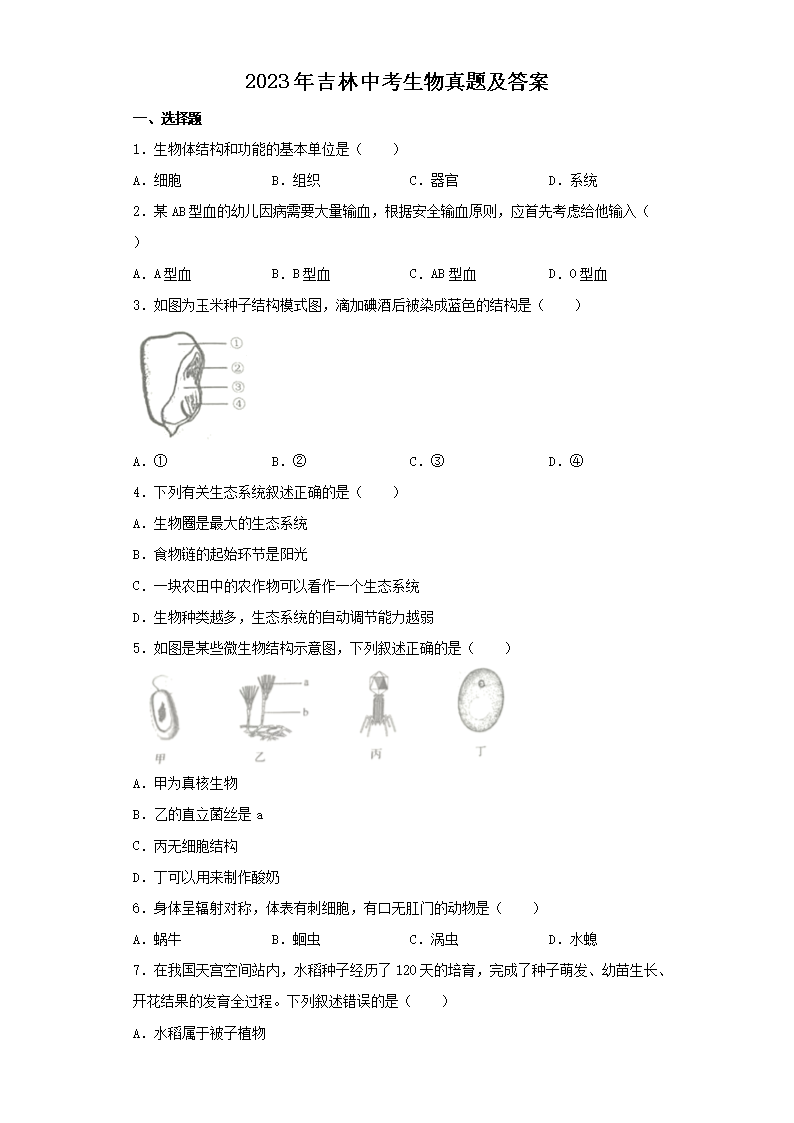 【文档预览】 文档大全网整理发布2023年吉林中考生物真题及答案(Word版),前五页预览如下:
