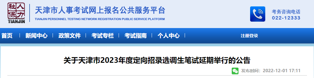 根据当前新冠肺炎疫情情况和防控工作需要,为保障广大考生健康安全,经研究,原计划于12月10日(星期六)举行的天津市2023年度定向招录选调生笔试延期举行,具体时间另行通知。