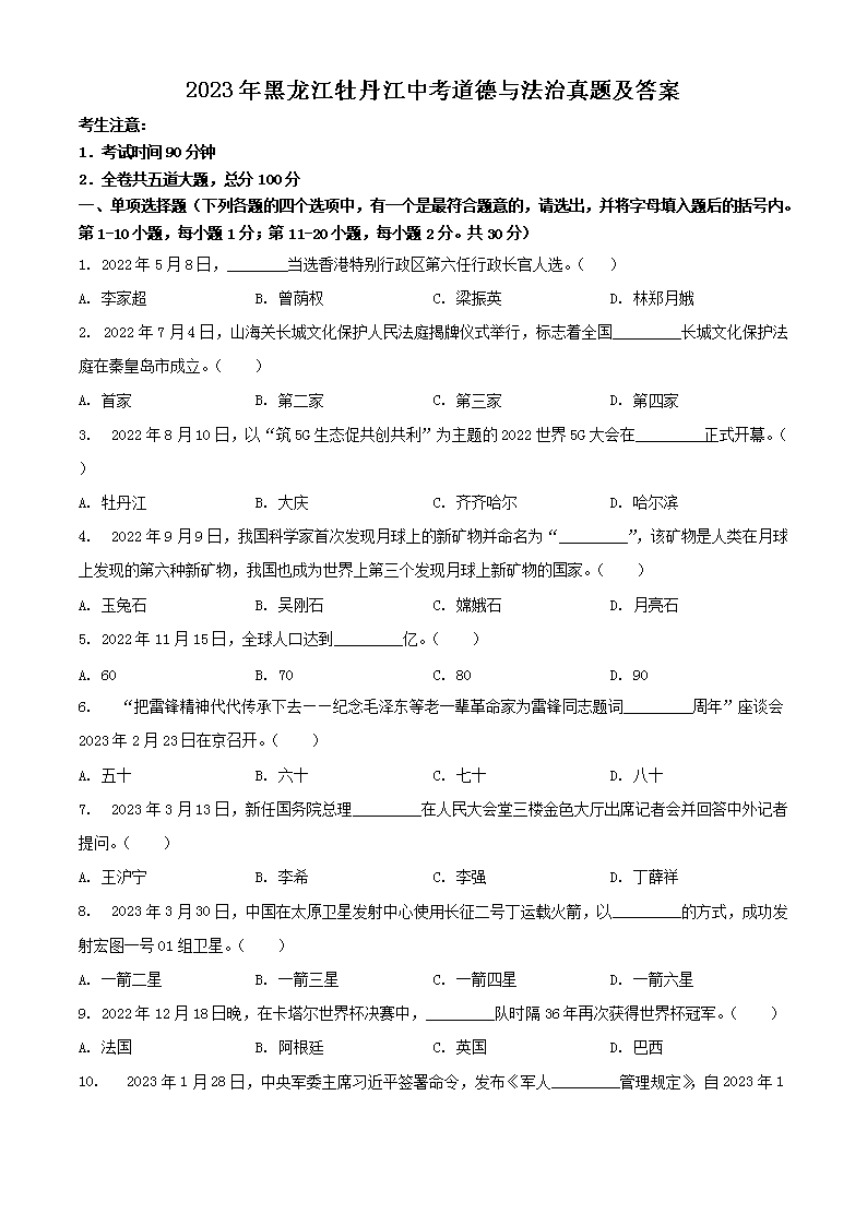 2023年黑龙江牡丹江中考道德与法治真题及答案(Word版)06-30