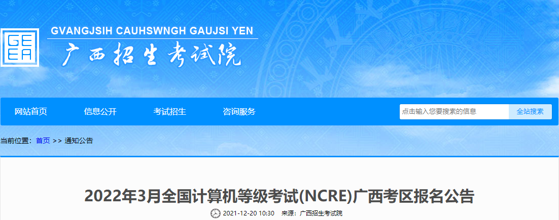 广西计算机等级考试报名时间:2021年12月28日9:00至2022年1月6日17:00、2022年3月1日9:00至3日23:55