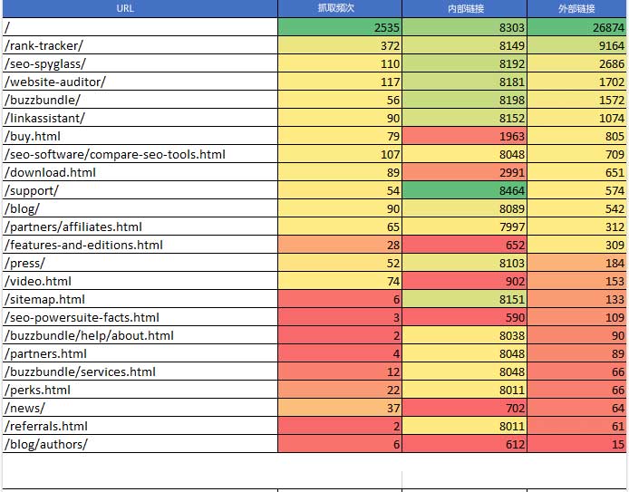 然后,我分析了服务器日志中的抓取统计信息,以了解百度每次访问每个网页的频率。最后,我将所有这些数据放入电子表格中,并计算内部链接和抓取预算以及外部链接和抓取预算之间的关联。
