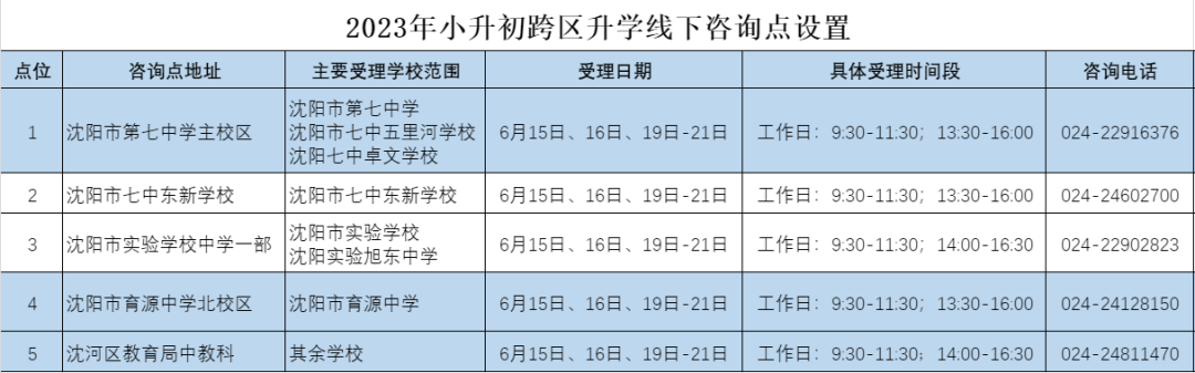 2.为方便家长填报相关信息,沈河区教育局设立如下五个“线下咨询点”。填报过程中,如有不明事宜或有特殊情况,可拨打对应咨询点电话或前往现场咨询。