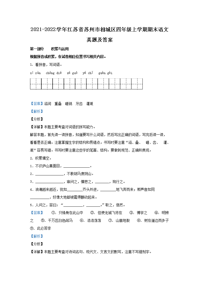 【文档预览】 文档大全网整理发布2021-2022学年江苏省苏州市相城区四年级上学期期末语文真题及答案(Word版),前五页预览如下: