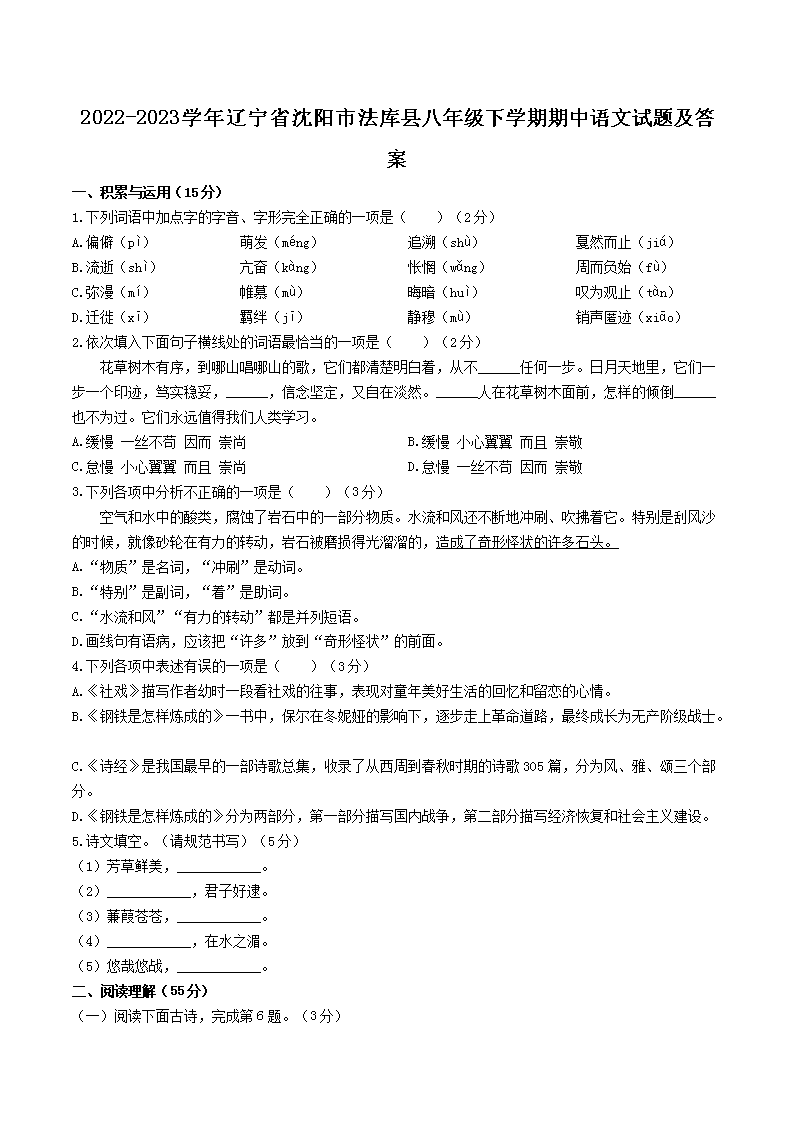 2022-2023学年辽宁省沈阳市法库县八年级下学期期中语文试题及答案(Word版)10-14