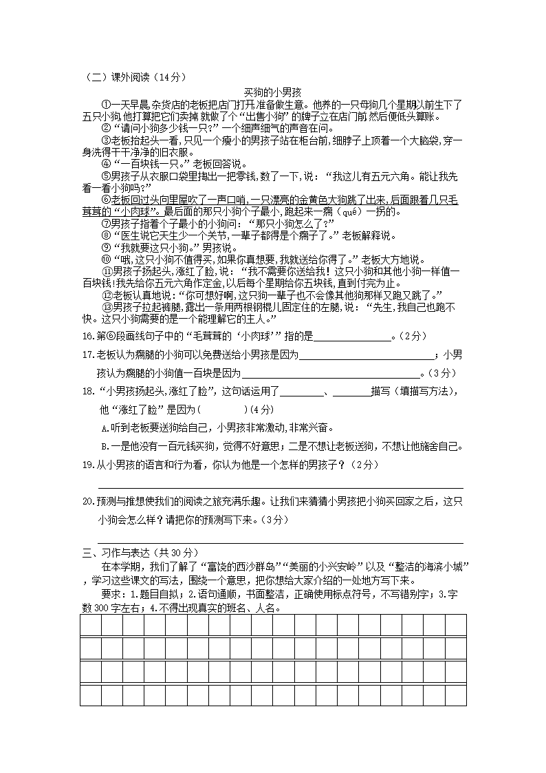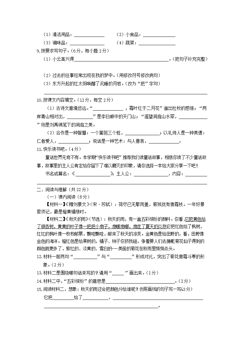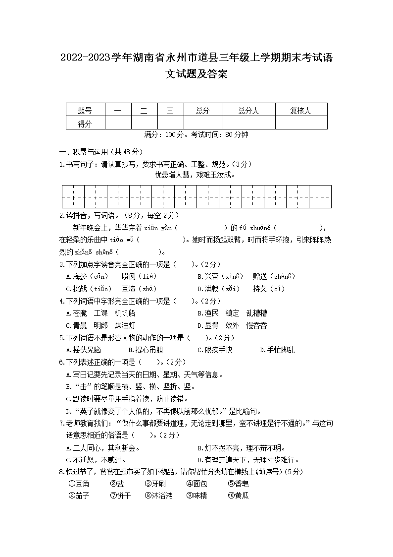 2022-2023学年湖南省永州市道县三年级上学期期末考试语文试题及答案(Word版)09-26