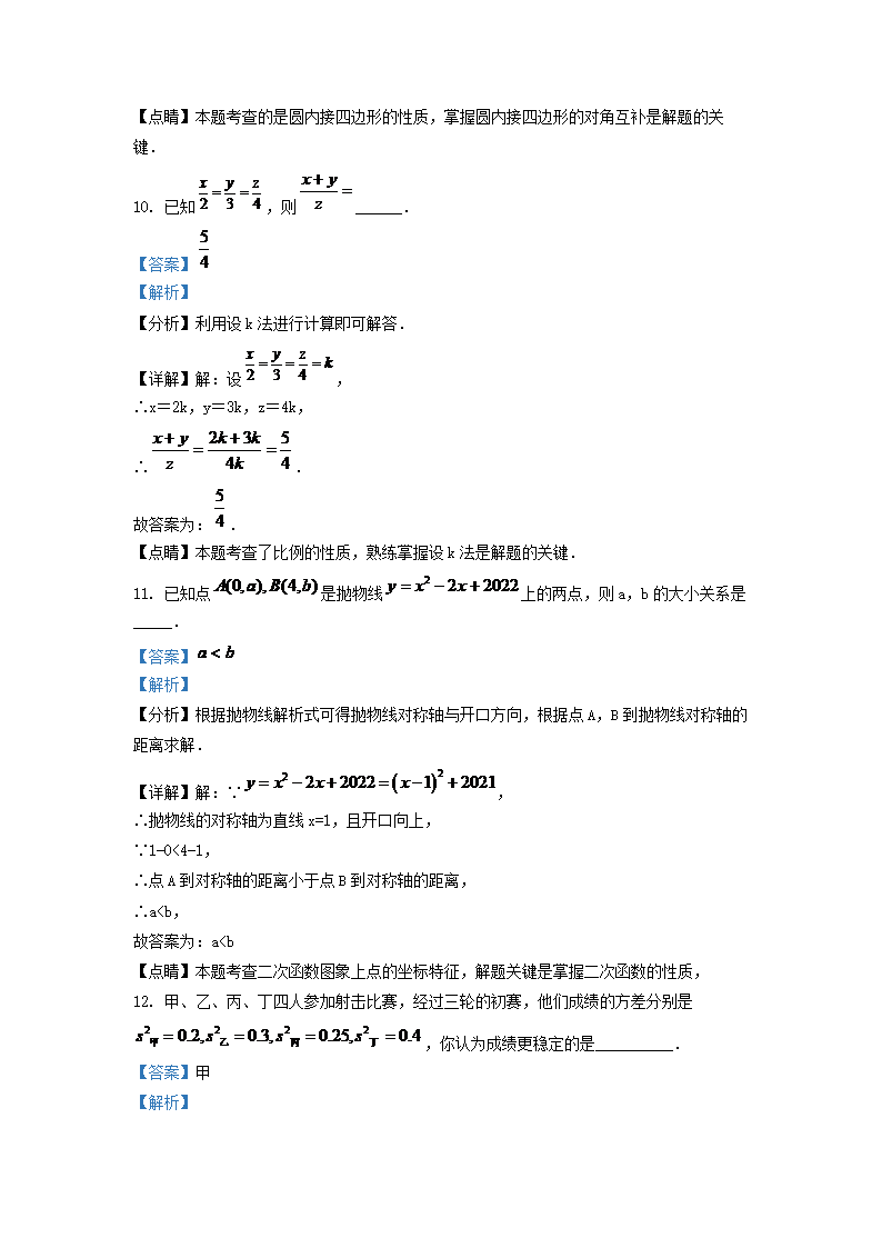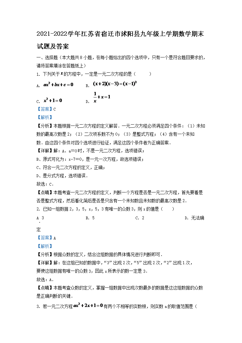 2021-2022学年江苏省宿迁市沭阳县九年级上学期数学期末试题及答案(Word版)09-28