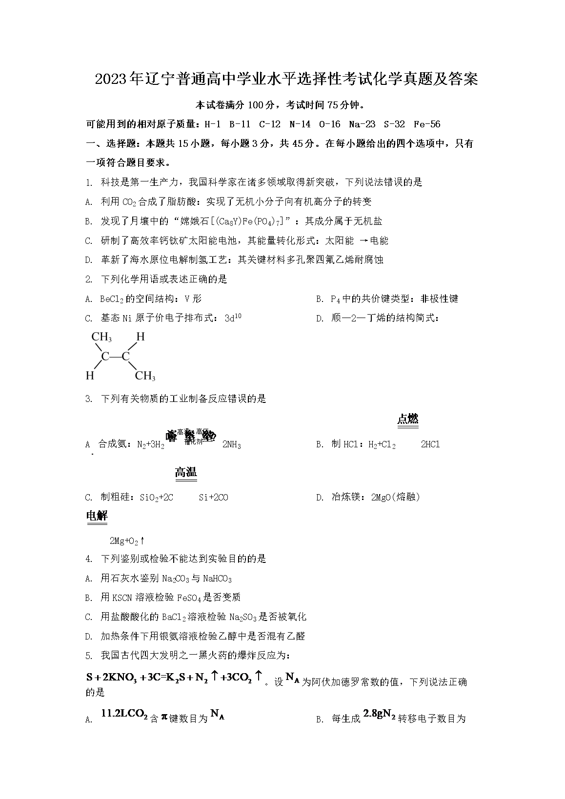 【文档预览】 文档大全网整理发布2023年辽宁普通高中学业水平选择性考试化学真题及答案(Word版),前五页预览如下: