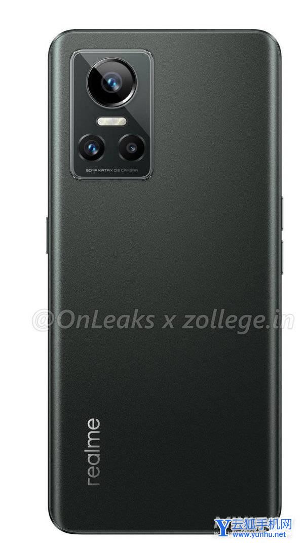 该机采用了后置三摄,三颗摄像头呈“三角形排布”,长条形闪光灯位于中央位置,下方紧接着双条赛道条纹,条纹底部还夹藏了 realme 的标识,整体给人一种偏电竞风的感觉。
