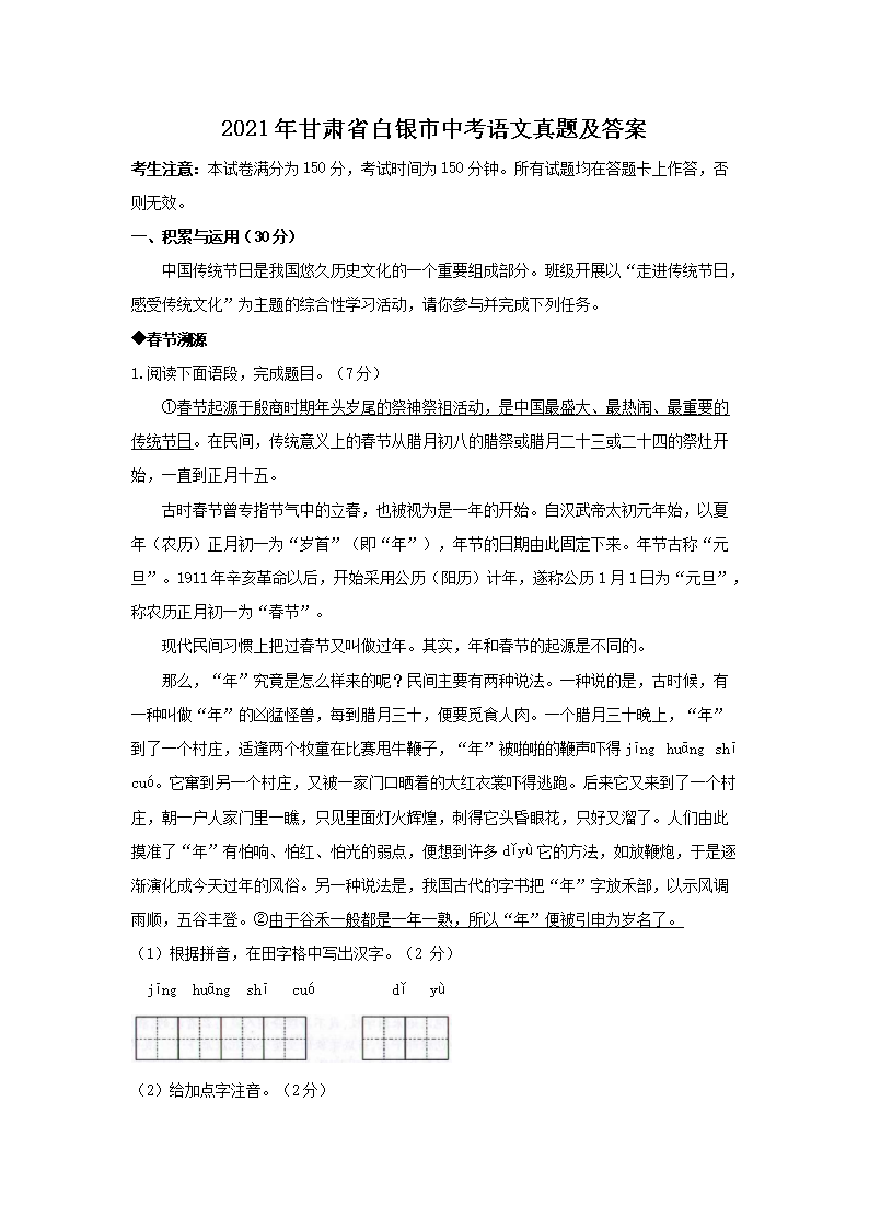 【文档预览】 文档大全网整理发布2021年甘肃省白银市中考语文真题及答案(Word版),前五页预览如下: