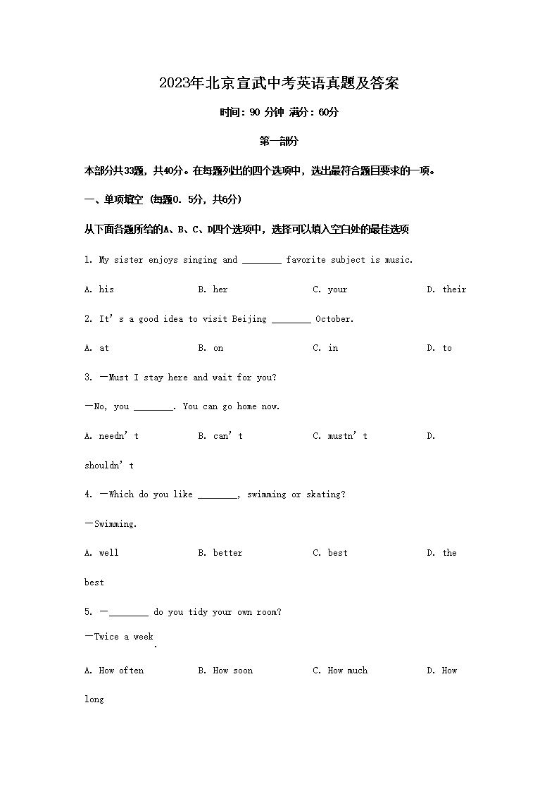 【文档预览】 文档大全网整理发布2023年北京宣武中考英语真题及答案(Word版),前五页预览如下: