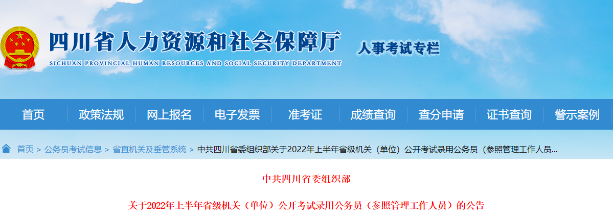 【#公务员考试# 导语】四川省人力资源和社会保障厅发布了《2022上半年四川省级机关(单位)公开考试录用公务员(参照管理工作人员)公告》,®文档大全网从公告中获悉,2022上半年四川省考公务员报名时间:2月24日-3月2日,考试时间:3月26日,具体事宜详见《招考公告》,®文档大全网小编在此将相关信息摘录如下,预祝大家顺利成“公”!