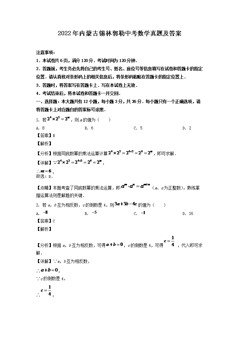 2022年内蒙古锡林郭勒中考数学真题及答案(Word版)06-08