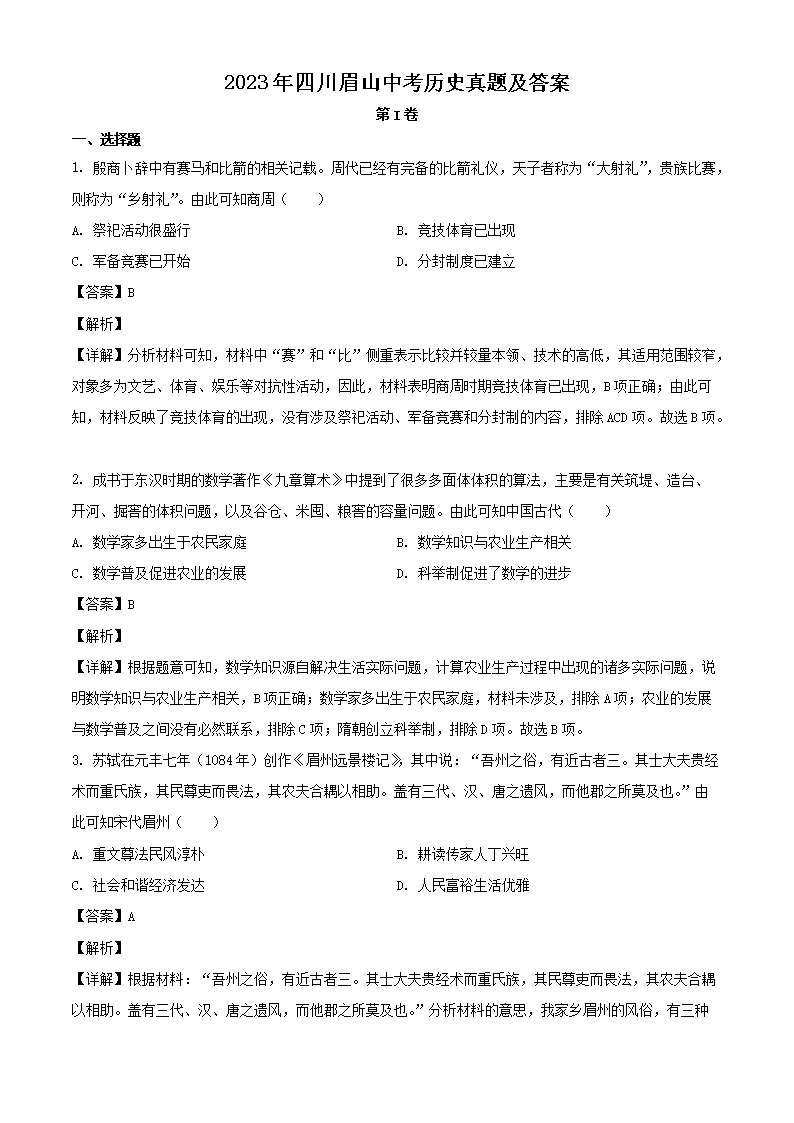 2023年四川眉山中考历史真题及答案(Word版)06-22